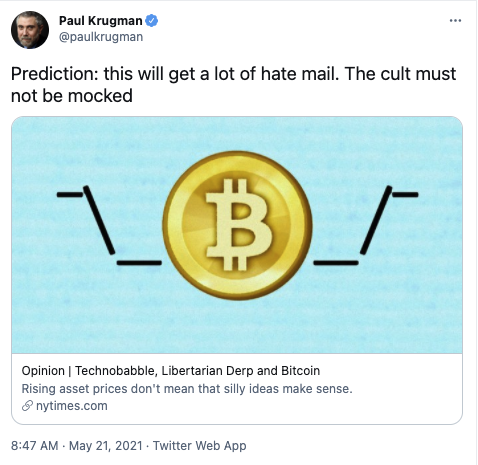 5月21日,诺贝尔经济学奖获得者保罗·克鲁格曼(Paul Krugman)在推特上转发了一篇其发表在《纽约时报》上对比特币的评论文章,并附文称“预测将收到很多仇恨邮件”。在其评论文章中,克鲁格曼表示,比特币之类的加密货币资产是一个庞氏骗局。他认为,过去12年以来,比特币在正常的经济活动中几乎不起作用。