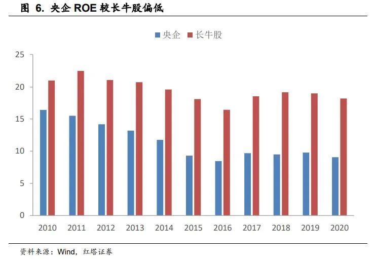 与之对比,很多长牛股票的ROE都是长期居于相对高位,2020年长牛股的ROE高达18.24%,但央企却仅有9.06%。在过去十年内,央企的ROE水平每年都要低于长牛股,两者的差距也在逐渐拉大。
