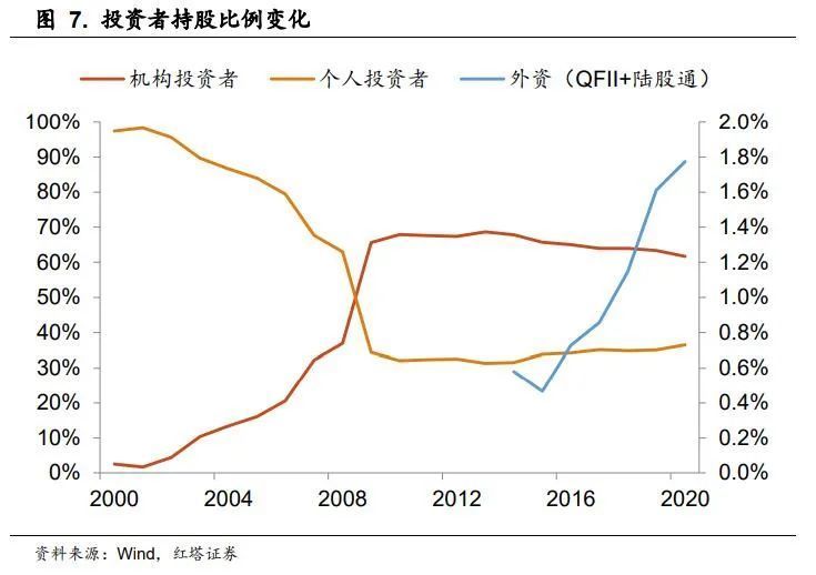 近年来,机构投资者与外资的持股占比逐渐提升。自2009年以来,机构投资者的持股占比持续维持在60%以上,在市场中的话语权越来越重。