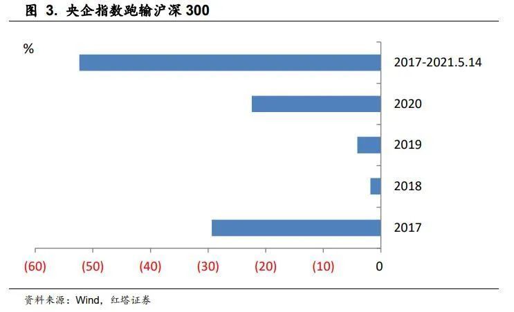 2017年以来,央企连续四年的年度收益率均跑输沪深300。我们还统计了从2017年1月1日至2021年5月14日的指数累计收益,央企指数的涨幅仅有2.04%,而同期沪深300的涨幅高达54.39%,相对于亮眼的业绩表现,央企的市场表现明显有些令人失望。