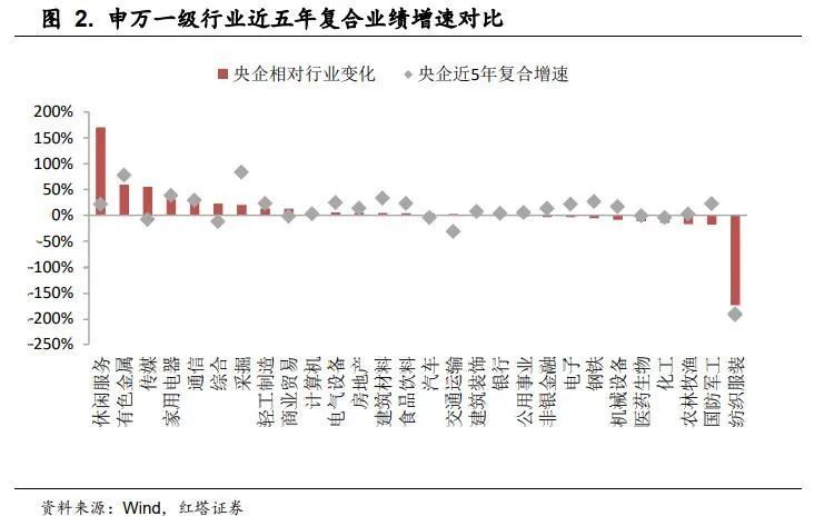 分行业来看,央企近5年业绩复合增速也要高于大多数同行业的平均水平。在申万28个一级行业中,有16个行业的央企表现优于行业平均,其中休闲服务、有色金属、传媒的央企增速均高于所属行业水平的50个百分点以上。