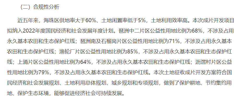 不过,方案中也明确表示,此次片区开发公益性用地的比例会偏多,琶洲中二片区公益性用地比例为68%、琶洲南及石榴岗片区公益性用地比例为71%、渔轮厂片区公益性用地比例为85%、上涌片区公益性用地比例为64%、沥滘村片区公益性用地比例为79%。