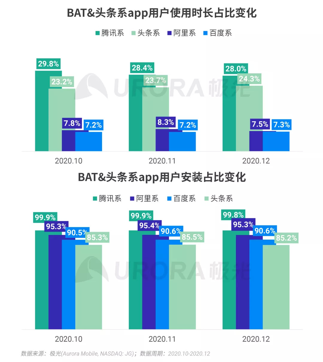 来自极光大数据的信息显示,2021年第一季度,在用户使用时长占比这一维度上,腾讯系App的整体渗透率保持领先,其次为头条系,渗透率和时长占比稳步上升,三月份达到25.7%,而百度系则为6.1%到6.7%。