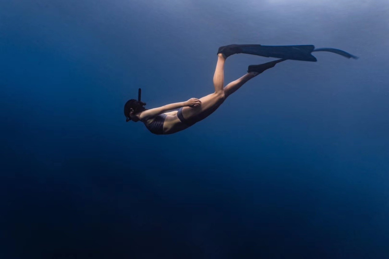 第一次参加王小觅潜水平台的活动,是潜先森的一个水下摄影分享会。皮肤黝黑的自由潜教练在屏幕上播放他水摄的作品,深蓝的背景下,穿着脚蹼的模特像美人鱼一样飘逸在画面中央,阳光从她的头顶透过海水形成一道道折射的光,将静谧幽深的蓝色分隔成明暗交替的色块,那是一种身临其境的观看体验,在无声却流动的蓝色里,无论往上还是往下,都是神秘的吸引。