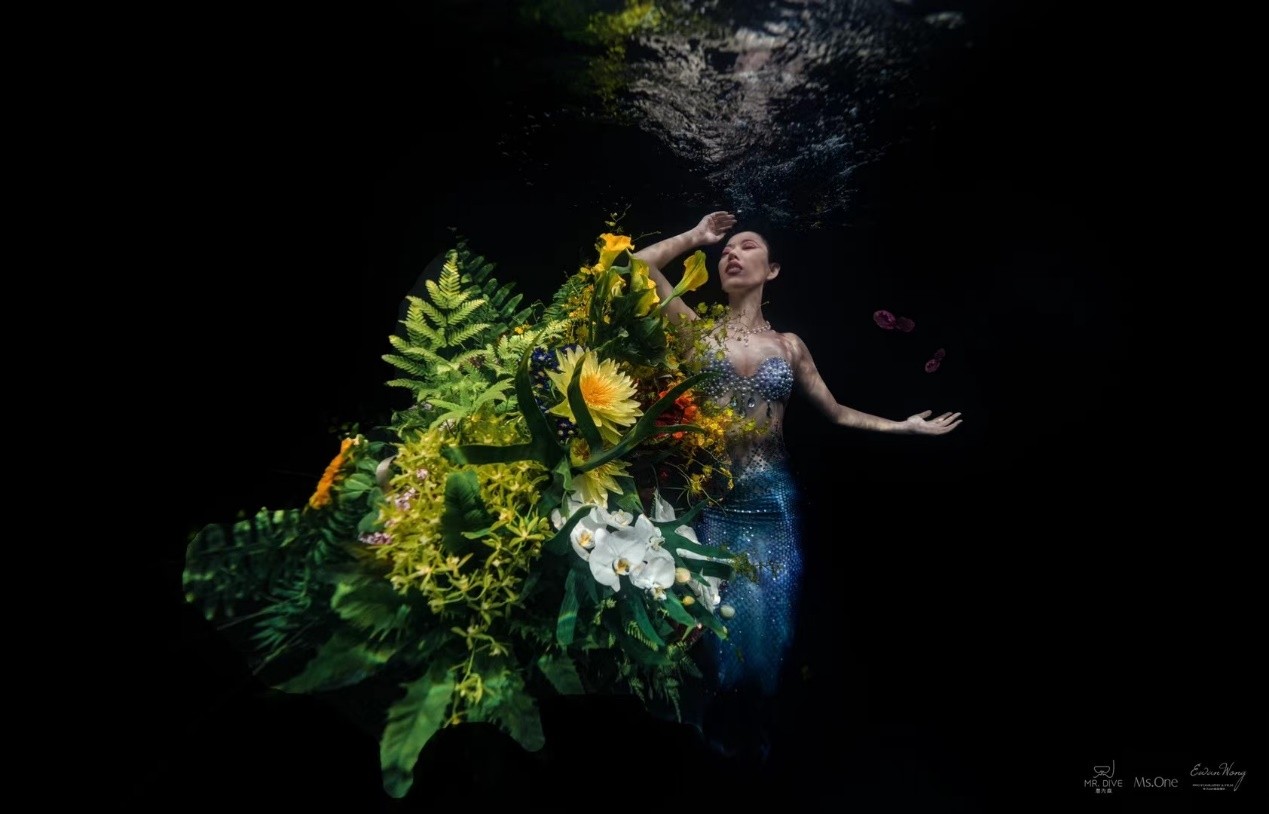 成都人特别爱讲生活美学,王小觅则挖掘海洋美学,她把插花艺术跟潜水、水摄相结合,陆地的花草,跟海里的藻类相遇,金风玉露一相逢,便胜却人间无数。