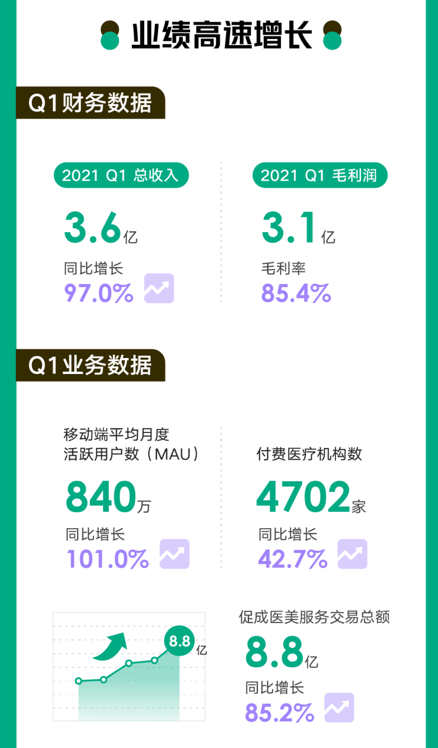 社区生态繁荣,机构服务优化,再加上品牌曝光和市场推广的强力加持,新氧不断赢得更多医美用户的认知和认可,不仅在2021年Q1实现平均月活跃用户同比增长101%,在过去的2020年四个季度,这一增幅均超过100%。