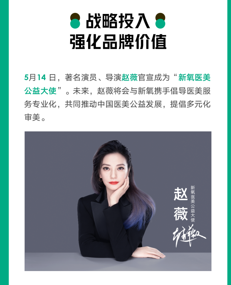 持续强化品牌护城河,新氧近日又有新举措。5月14日,著名演员、导演赵薇官宣成为“新氧医美公益大使”,赵薇将会与新氧携手倡导医美服务专业化,共同推动中国医美公益发展,提倡多元化审美。