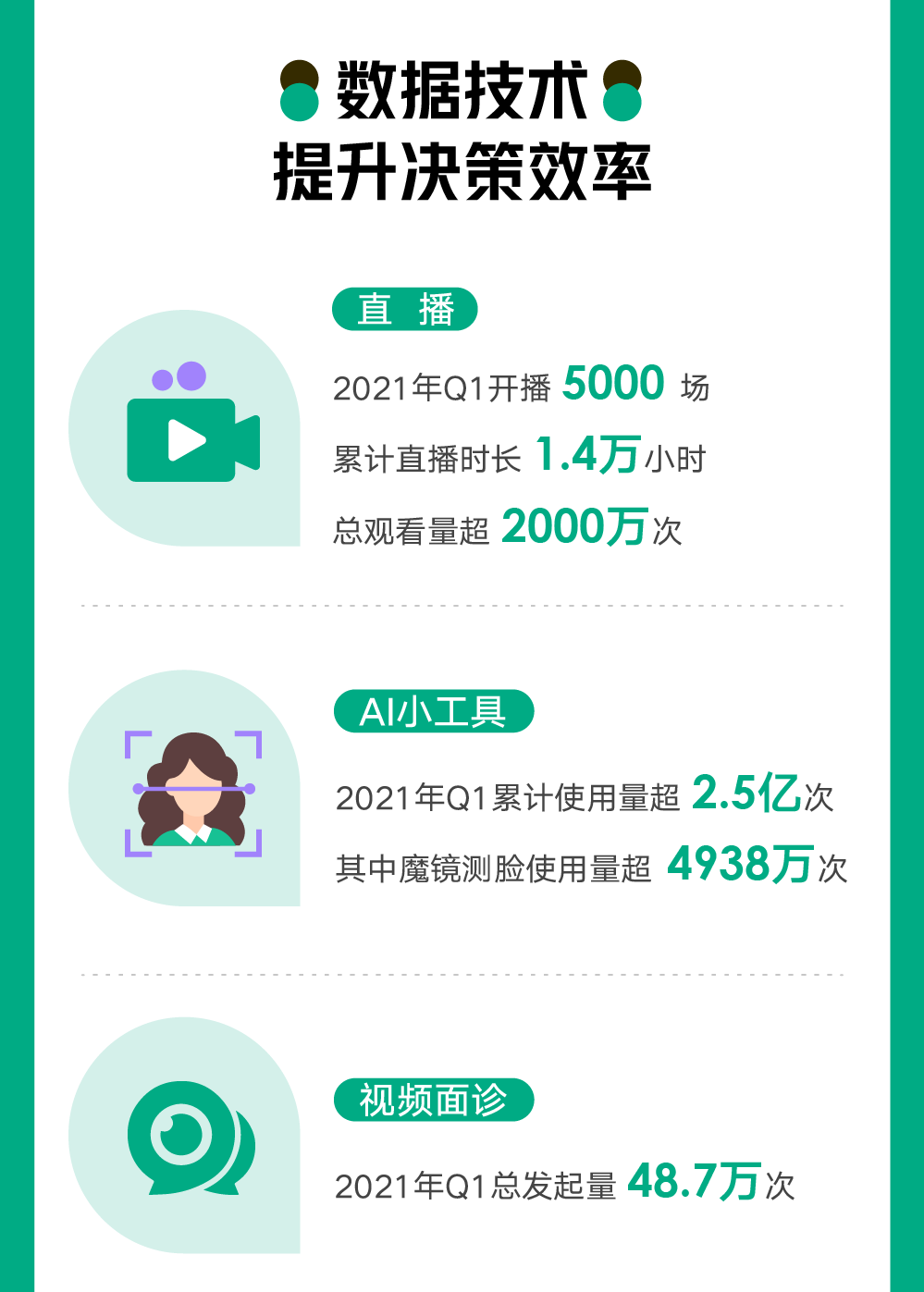此外,视频面诊、魔镜测脸等工具,也已经成为新氧用户必不可少的在线辅助工具。今年一季度,新氧视频面诊发起量48.7万次,单日最高发起量14729次。包括魔镜测脸在内的新氧AI小工具,一季度使用量超过2.5亿次。