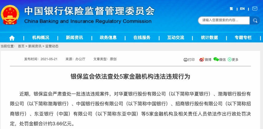 5月21日,银保监会官网披露,银保监会近期严肃查处一批违法违规案件,对华夏银行、渤海银行、中国银行、招商银行、东亚银行(中国)有限公司(下称“东亚中国”)等5家金融机构及相关责任人员依法作出行政处罚决定,处罚金额合计约3.66亿元。