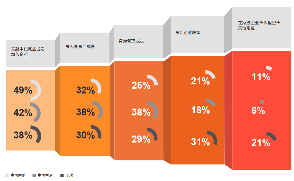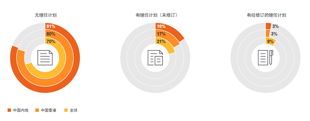 在继任计划方面,调研数据显示,只有19%的中国内地家族企业受访者和20%的香港受访者拥有健全的、明文记载且清晰传达的继任计划书,而全球有30%的家族企业有明确的继承计划。