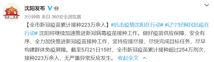 据@沈阳发布 微博消息,截至5月21日15时,沈阳全市新冠疫苗累计接种超过254万剂次,接种223万余人。