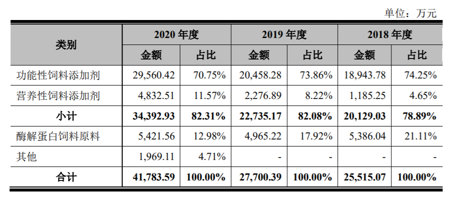 招股书显示,美农生物主营业务收入主要来源于功能性饲料添加剂、营养性饲料添加剂和酶解蛋白饲料原料。