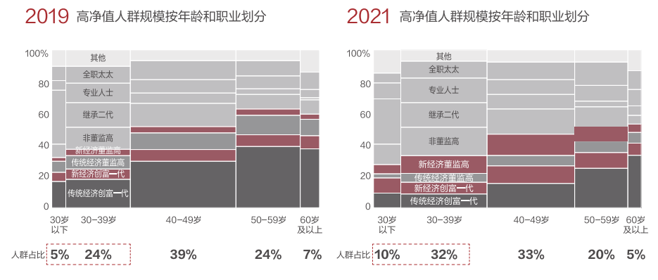 在新经济、新行业快速发展的推动下,年轻群体的创富速率加快,40岁以下的高净值人群中以新经济董监高、新经济创富一代为代表的新富群体占比显著提升,已成为高净值群体的中坚力量。其中,40岁以下高净值人群的比例由2019年的29%升至2021年的42%,年轻化趋势凸显。