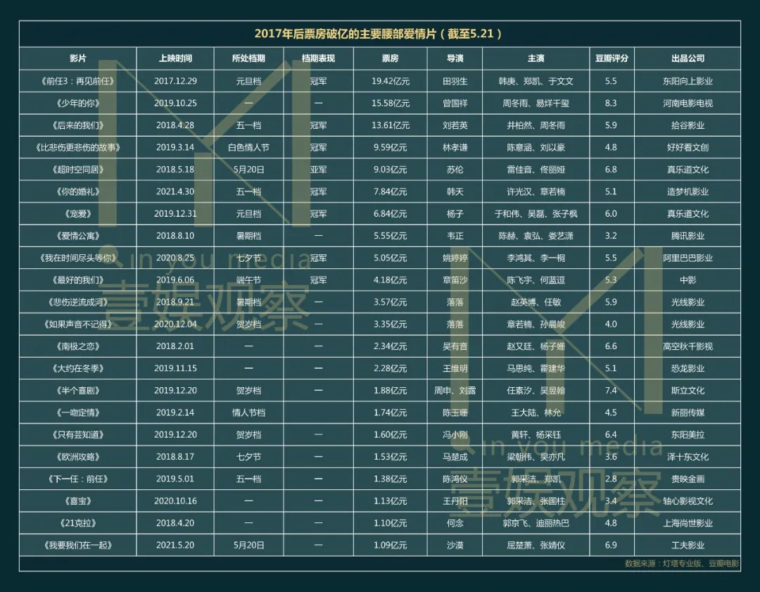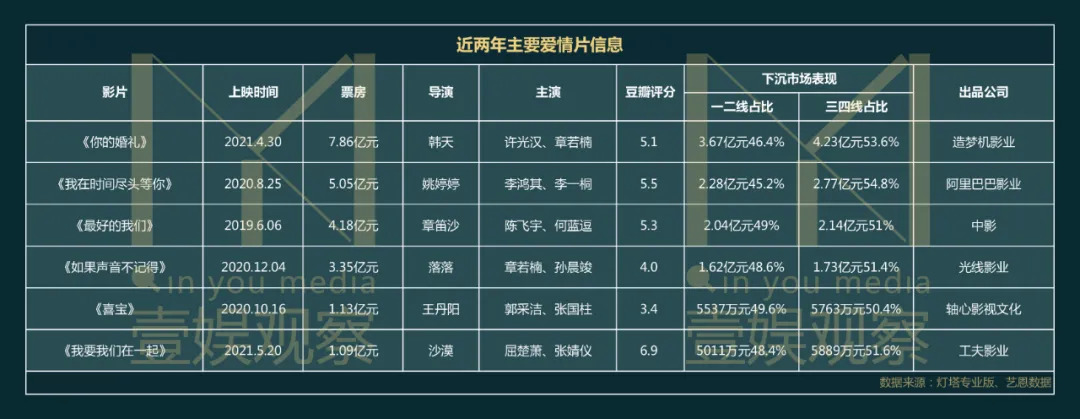 壹娱观察(ID:yiyuguancha)整理了近两年主要爱情片信息,通过主创阵容构成、下沉市场表现、出品公司战术布局等方面进一步分析。