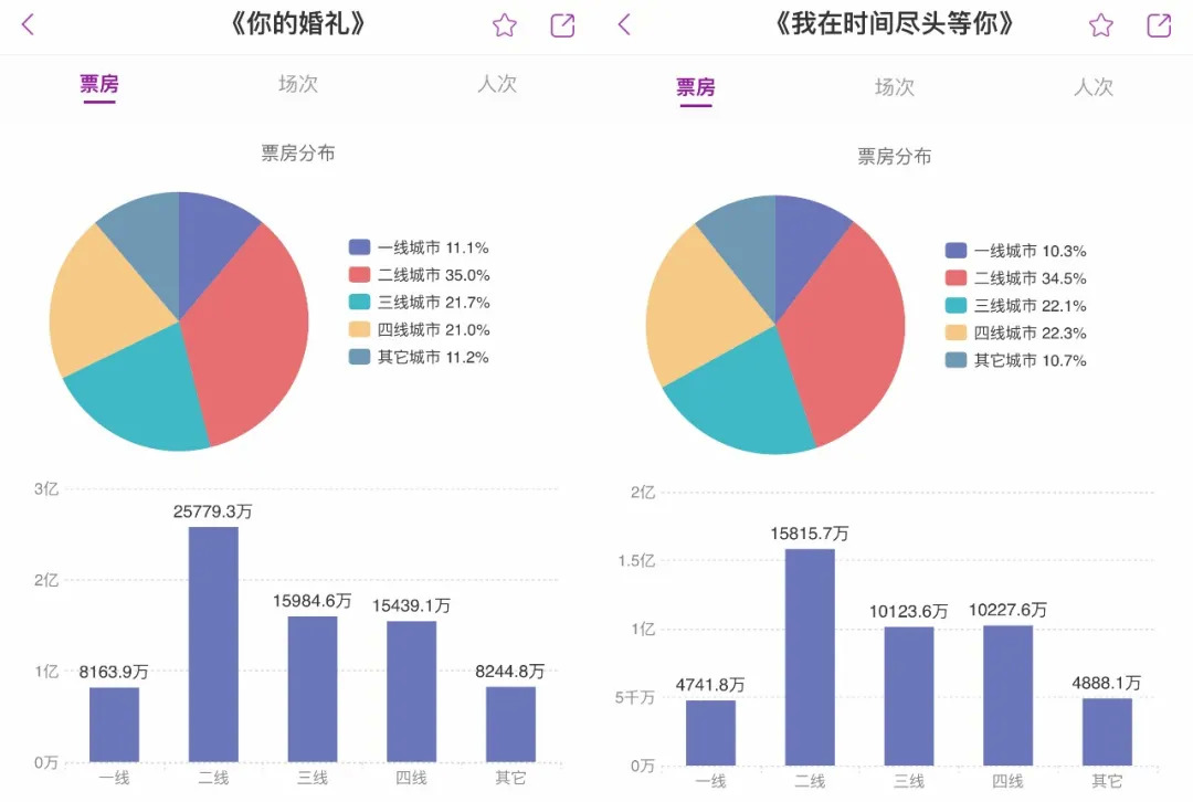 图表中影片《你的婚礼》是近两年最卖座的爱情电影,截至目前的7.9亿票房城市分布,三四五线占比54%,《我在时间尽头等你》5.05亿票房中三四五线占比达55%。