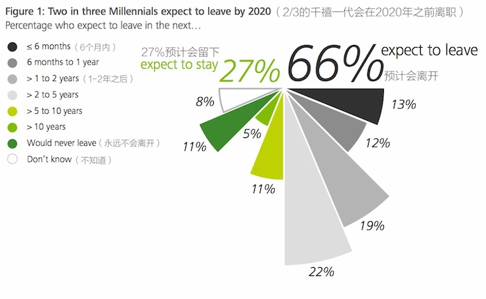 报告显示,44%的千禧代受访者希望在未来两年内更换任职公司,而计划在2020年之前离职的受访者比例更高达66%。这项调查有300名来自中国地区的受访者参与,他们中认为自己2020年以前至少换一次工作的人占65%。他们希望通过跳槽获得更多学习发展的机会以及寻找理想的工作与生活平衡的状态。