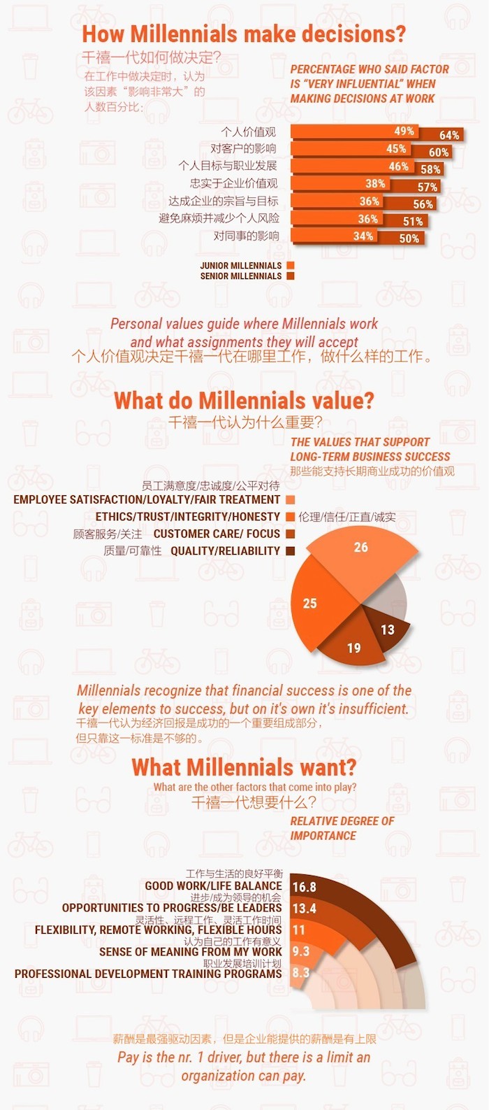 调查发现,千禧一代希望用更多的时间探讨新的工作方式、提升技能以及得到前辈的指导。他们更急迫地想发挥个人价值,想胜任领导职务,对职业未来发展空间的要求也更高。但相比赚取更高的薪酬,87%的受访者表示挑选雇主首先看重企业的价值观。千禧代期望企业能从社会责任践行的角度提升对内部员工、外部客户以及产品本的关注,而不仅仅是以金钱利益为重。73%的受访者认为商业行为对整个社会环境拥有巨大影响。