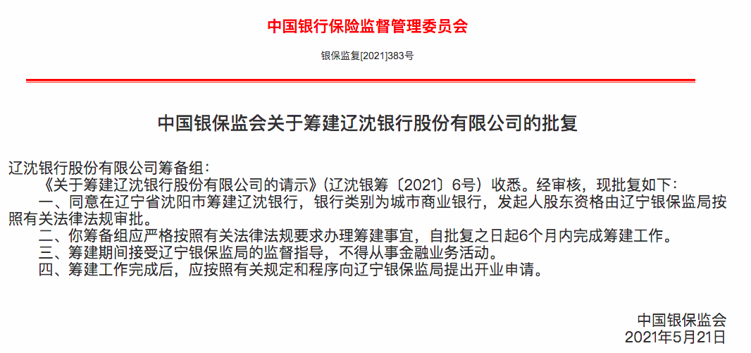 银保监会21日在官网发布《关于筹建辽沈银行股份有限公司的批复》,同意在辽宁省沈阳市筹建辽沈银行,银行类别为城市商业银行,发起人股东资格由辽宁银保监局按照有关法律法规审批。