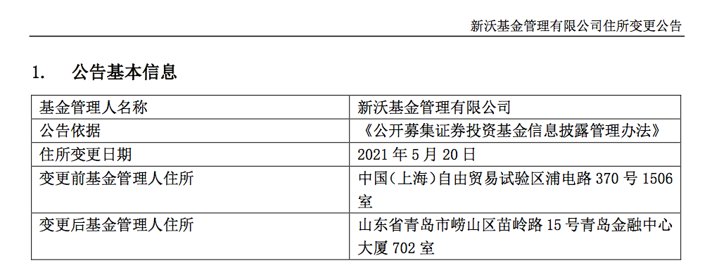 5月21日,新沃基金发布公告称,基金管理人住所由中国(上海)自由贸易试验区浦电路 370 号 1506 室变更为山东省青岛市崂山区苗岭路 15 号青岛金融中心大厦 702 室。这意味着新沃基金正式从上海迁址青岛,落户崂山区,成为青岛市第二家公募基金公司。