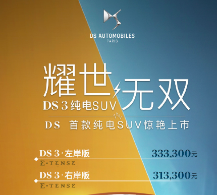 据@DS汽车 微博消息,2021年5月21日,DS首款纯电SUV车型DS 3正式上市,新车共推出两款车型,售价区间为31.33-33.33万元。