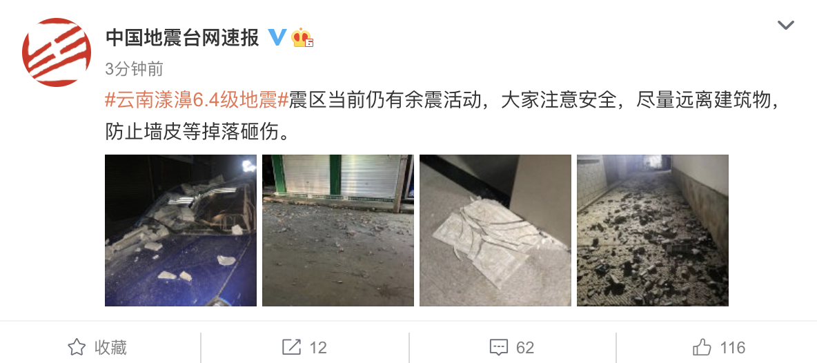 据@中国地震台网速报 微博消息,北京时间5月21日晚,大理市漾濞县发生多次地震,最高震级6.4级,震源深度8千米。震区当前仍有余震活动,@中国地震台网速报 提醒大家注意安全,尽量远离建筑物,防止墙皮等掉落砸伤。