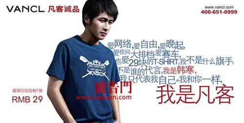 2010年7月凡客诚品邀请韩寒和王珞丹出任形象代言人,系列广告铺天盖地出现(有点像最近的今日头条那段铺天盖地)。该广告系列意在戏谑主流文化,彰显品牌的自我路线和个性形象。