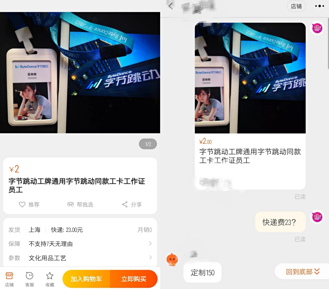 假工牌能用来做什么?淘宝上一个制作“字节跳动同款工牌”的商家告诉燃财经:“我们并不是印刷厂,只是最近字节工牌很火,所以就做了这个。接触到的买家,大部分人是为了‘装逼’,也有人说是为了出入方便,还有人说是工卡丢了要补办一个。”