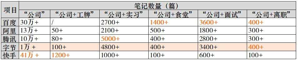 其次,字节被开玩笑最多的“工牌”和“晒食堂”梗,其笔记数量也并不多。“工牌”相关笔记竟然不如快手,“食堂”相关笔记数量也比不上百度。