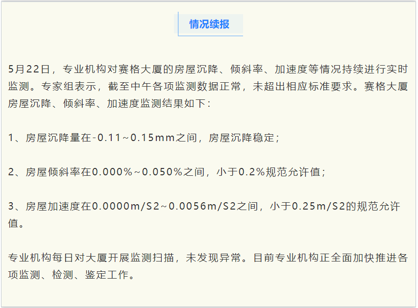 据“深圳发布”22日发布赛格大厦实时监测情况续报称,5月22日,专业机构对赛格大厦的房屋沉降、倾斜率、加速度等情况持续进行实时监测。专家组表示,截至中午各项监测数据正常,未超出相应标准要求。