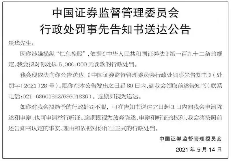日前,证监会行政处罚事先告知书送达公告在上证报刊发,告知景华因涉嫌操纵“仁东控股”,将被处以500万元罚款。暴涨后经历14个跌停的“杀猪盘”仁东控股幕后庄家逐渐浮出水面。