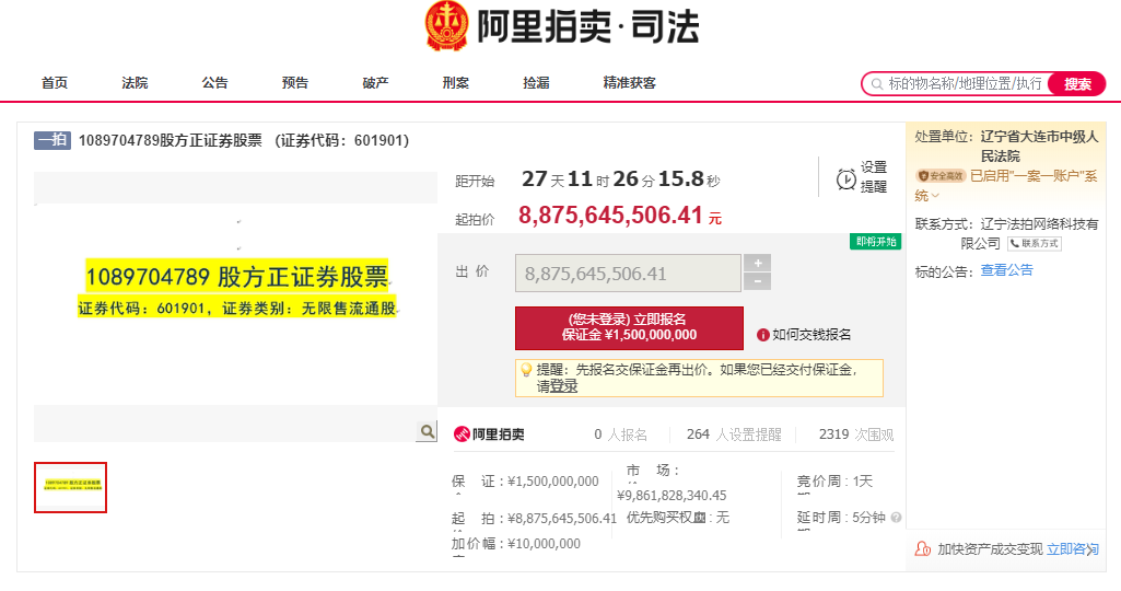 据“阿里拍卖”微信公众号23日消息,10.9亿股的方正证券股票,将于6月19日10时至6月20日10时公开拍卖,目前的公示起拍价为88.76亿元,本次拍卖的股票占方正证券股份有限公司总股本约13.24%,整体拍卖。