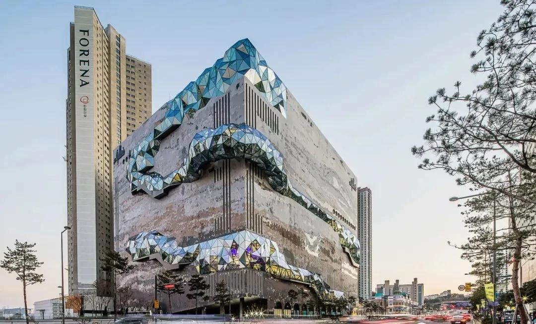 ▲2020年3月,韩国Galleria百货光教店开业。Galleria光教店位于城市发展区的中心,周围被高层住宅包裹,雕塑般的外形赋予其自然气质,以玻璃雕塑嵌入马赛克立面的独特设计,一经亮相,并刷屏网络。大楼建筑造型被塑造得如石块一般质感,与富有肌理质感的马塞克石材外立面相搭配,让人联想邻近的水原光教湖公园的自然景色。在石材体量上开凿出的公众路线连接公共人行道至天台花园,沿途带来各式零售商业和文化活动体验。公众路线有着像经过雕琢的宝石般的多棱玻璃立面,与不透光的石材形成强烈对比,城市的途人可透过玻璃看到室内的零售和文化活动。