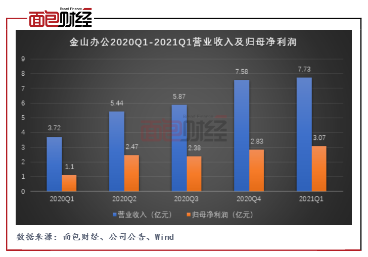 图1:金山办公2020Q1-2021Q1营业收入及归母净利润