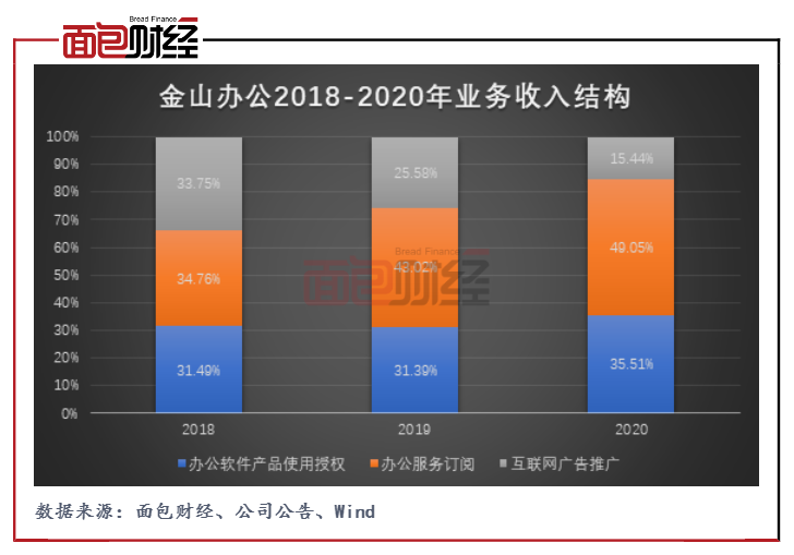 从业务收入结构来看,公司逐渐从办公软件厂商转型为云协作办公解决方案高级服务商。近三年来,公司互联网广告端收入比重分别为33.75%、25.58%及15.44%,营收比重持续下滑。