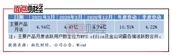 办公订阅服务是金山办公的核心增长力,营收比重从2018年的34.76%上升至2020年的49.05%。截至2021年3月31日,公司主要产品月度活跃用户(MAU)为4.94亿,同比增长10.51%。其中WPS office PC版月度活跃用户数 1.94 亿,较上年同期增长15.48%;移动版月度活跃用户数2.94亿,较上年同期增长8.49%。
