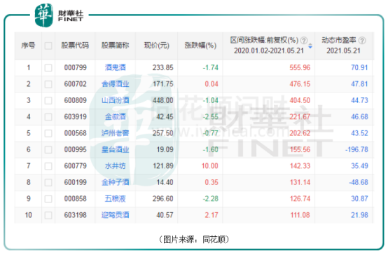 而数据则显示,2020年以来,股价表现最好的恰恰不是上述的头部酒企,反而是次一级的上市酒企,其中酒鬼酒(000799.SZ)的股价(前复权)在此期间已经飙涨了556%,领跑整个白酒板块,并且其股价在近日再度刷新了上市以来的新高。