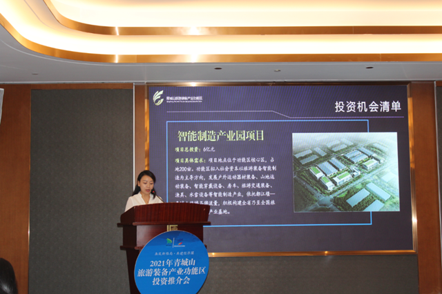 随后,青城山旅游装备产业功能区党工委委员、管委会副主任彭涛就都江堰城市魅力、文化底蕴、发展潜力、发展机遇作介绍,从功能区区位优势、城市配套、资源要素、产业规划、政务环境等方面,详细介绍了功能区在发展旅游装备制造、智能制造、健康休闲食品等领域的产业优势,并发布投资总额达97亿元的产业项目投资机会清单7个。