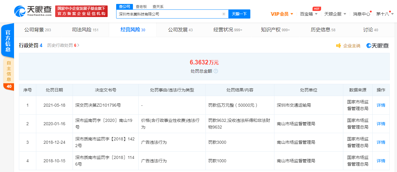 据天眼查APP显示,近日,深圳市丰巢科技有限公司新增一条行政处罚,决定文书号为深交罚决第ZD101796号,处罚结果为罚款5万元,处罚单位为深圳市交通运输局。