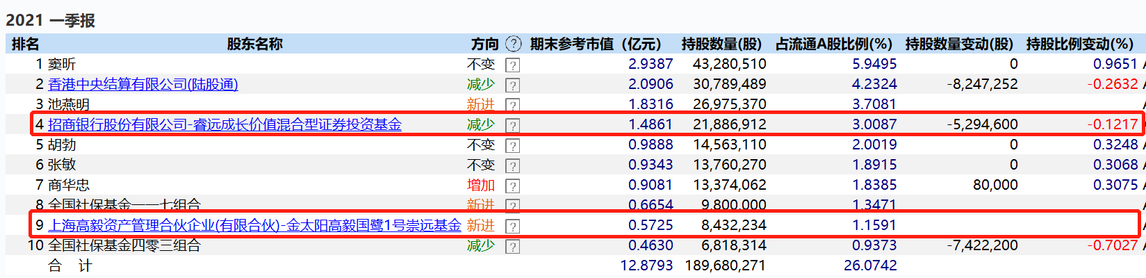 有意思的是,高毅旗下邱国鹭管理的金太阳高毅国鹭1号崇远基金则在一季度新杀入十大流通股东,截至一季度末,该私募产品持股843.22万股,期末参考市值达0.57%。