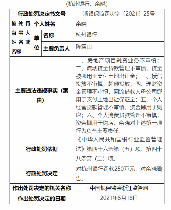 银保监会官网5月24日消息,据中国银保监会浙江监管局行政处罚信息公开表,杭州银行存在以下违法违规行为:一、房地产项目融资业务不审慎;二、流动资金贷款管理不审慎,资金被挪用于支付土地出让金;三、授信投放不审慎,超额投放;四、理财资金管理不审慎,回流借款人母公司挪用于支付土地出让保证金;五、个人经营贷款管理不审慎,资金挪用于购房;六、个人消费贷款管理不审慎,资金挪用于购房。余晓对上述第一项行为负有主要责任。银保监会浙江监管局对杭州银行罚款250万元,对余晓警告。