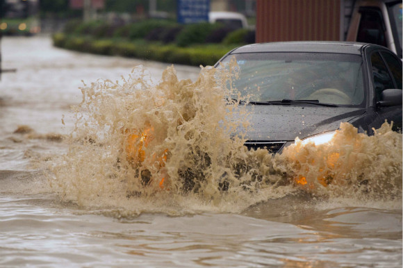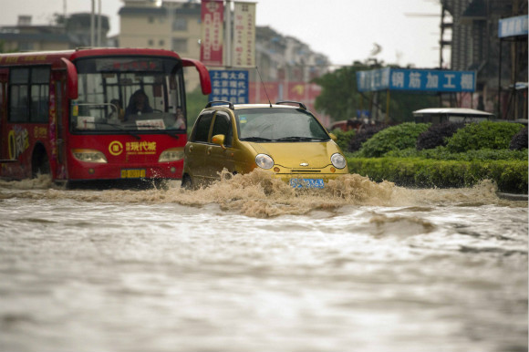 4月17日,广西壮族自治区桂林市永福县城,车辆通过积水路段。