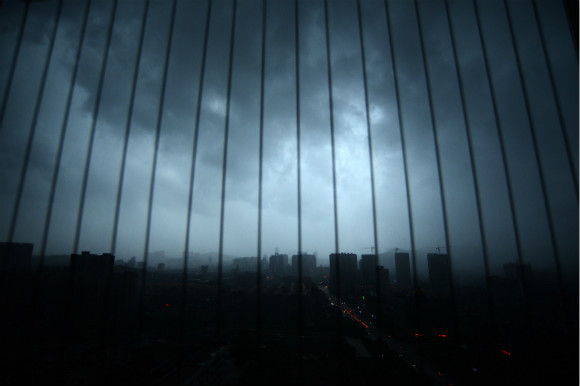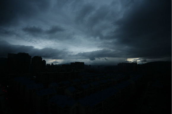 4月17日,湖南省郴州市,暴雨来临前,城市上空黑云压城,瞬间进入“黑夜”,宛如世界末日到来。