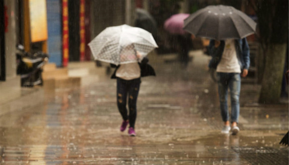 2016年04月17日,广西壮族自治区桂林市永福县城,市民冒雨出行。