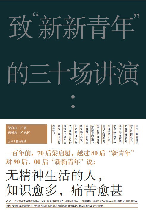 一百年前,“五四运动”前后的青年人也面对许多苦恼。在近期出版的《致“新新青年”的三十场讲演》一书中,梁启超试图回应青年人普遍关心的三个问题——在外界诱惑和压迫无法忽视的时刻,如何保持个人的人格?在人生遭遇忧患痛苦之时,如何才能获取精神的安慰?在学问和事业遭遇挫折时,如何才能继续向前?