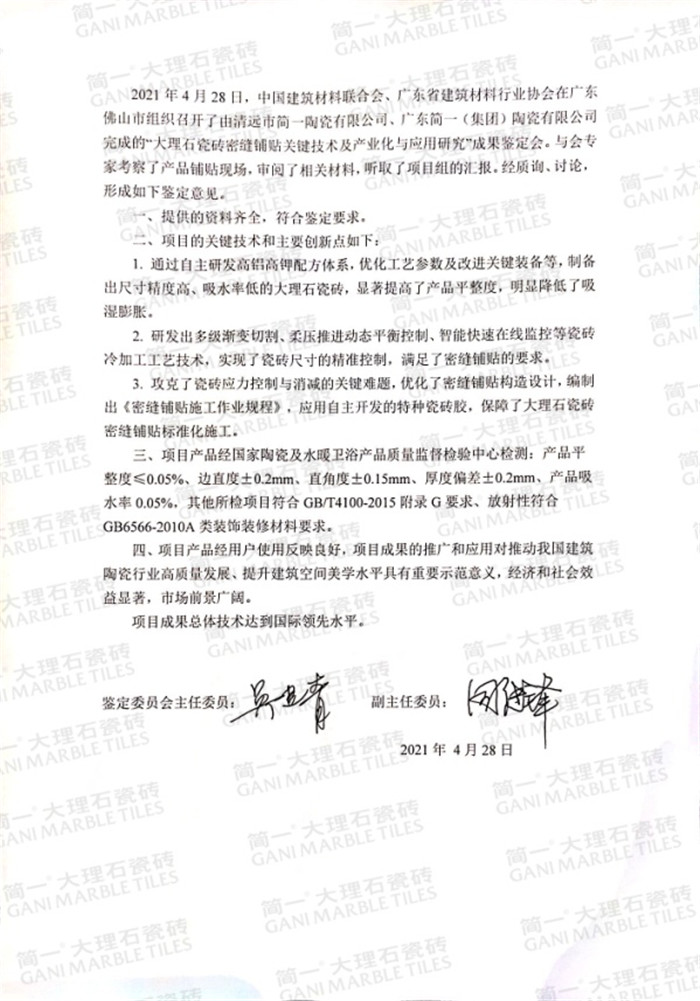 鉴定委员会经过现场考察,审阅了相关材料,听取了相关的工作报告、研究报告、经济及社会效益分析报告、用户使用报告等汇报,经鉴定委员会的质询与讨论,肯定了简一密缝铺贴技术在大理石瓷砖坯体配方、烧成技术、冷加工技术、密缝铺贴施工工艺和标准施工流程等多项关键技术上取得的突破。鉴定委员会一致认定 “大理石瓷砖密缝铺贴关键技术及产业化与应用研究”项目成果总体技术达到国际领先水平。