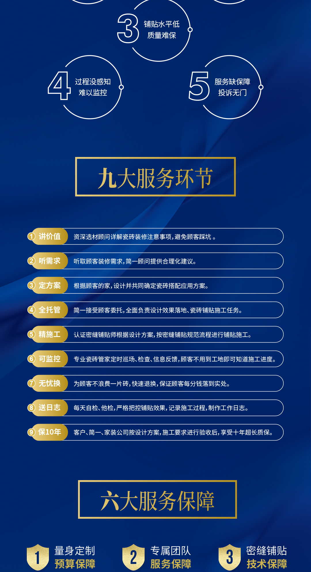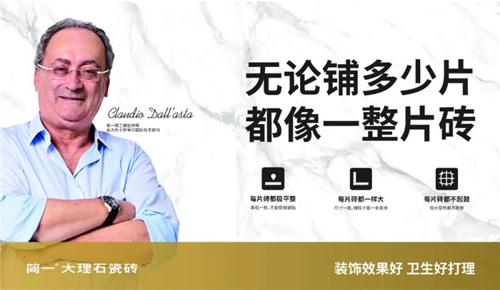 不仅仅是产品,简一联合意大利顶级施工专家Claudio(卡罗蒂尔)研发出国际领先的标准施工流程,确保无论铺多少片瓷砖,铺上都像一整片的空间效果。与此同时,简一建立了全国的系统化瓦工培训,专业瓦工团队打造一流的施工队伍。简一从产品品质、铺贴流程、专业团队、管理体系全方位构建成品交付服务工程。
