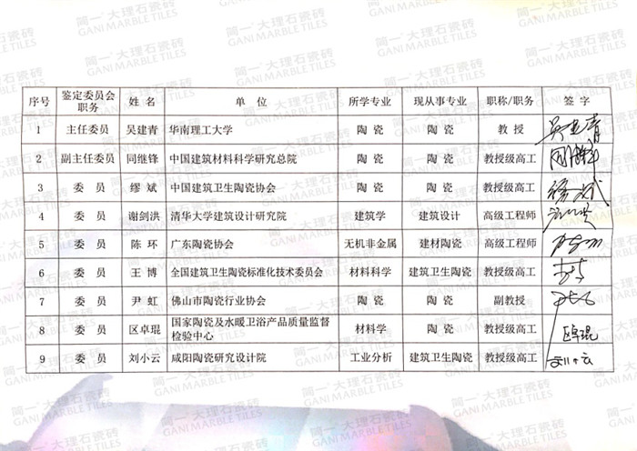 本次科技成果鉴定委员会由华南理工大学教授吴建青担任主任委员、中国建筑材料科学研究总院教授级高工、中国硅酸盐学会建筑卫生陶瓷专业委员会主任委员同继锋担任副主任委员,组成人员有中国建筑卫生陶瓷协会会长缪斌、广东省建筑材料行业协会常务副会长、广东陶瓷行业协会会长陈环、全国建筑卫生陶瓷标准化技术委员会秘书长、教授级高工王博、佛山市陶瓷行业协会秘书长、副教授尹虹博士、清华大学建筑设计院九分院副院长、高级工程师谢剑洪、国家陶瓷及水暖卫浴产品质量监督检验中心主任、教授级高工区卓琨、咸阳陶瓷研究设计院院长助理、陶瓷杂志社社长、教授级高工刘小云共9名专家组成。