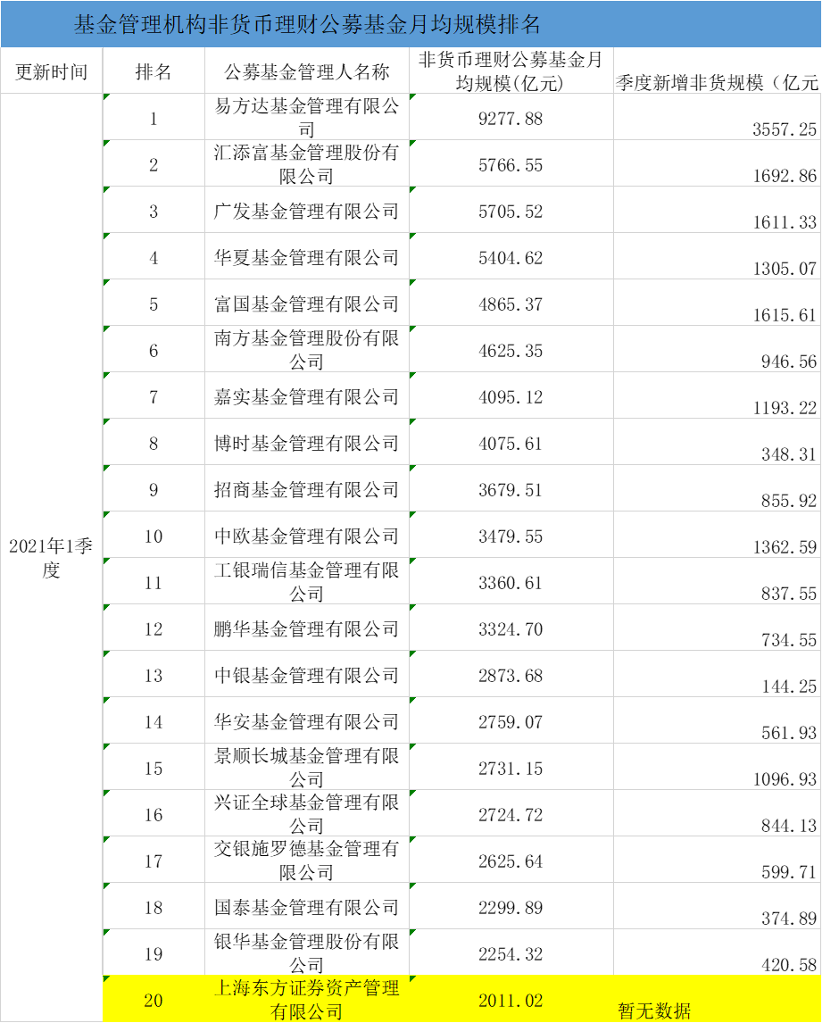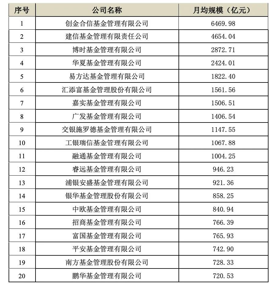 今日,基金业协会公布了一季度基金管理机构非货币理财公募基金的月均规模排名。