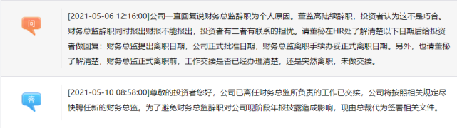 在投资者互动问答版块中,有投资者询问,“财务总监辞职同时报出财报不能报出,投资者有二者有联系的担忧”。对此易见股份在回复中表示,公司离任财务总监所负责的工作已交接,公司将按照相关规定尽快聘任新的财务总监;为了避免财务总监辞职对公司现阶段年报披露造成的影响,现由总裁代为签署相关文件。