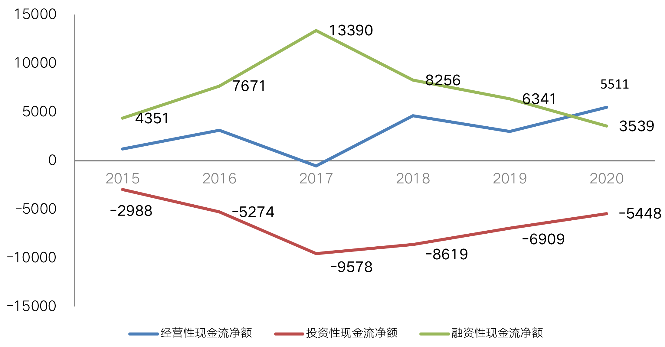 与融资性现金流的大规模下降形成鲜明对比的是,经营性现金流净额逐年增长并达到历年新高。2018年至2020年,经营性现金流净额连续三年为正,并在2020年达到历年最高至5511亿元,并首度超过了融资性现金流净额。